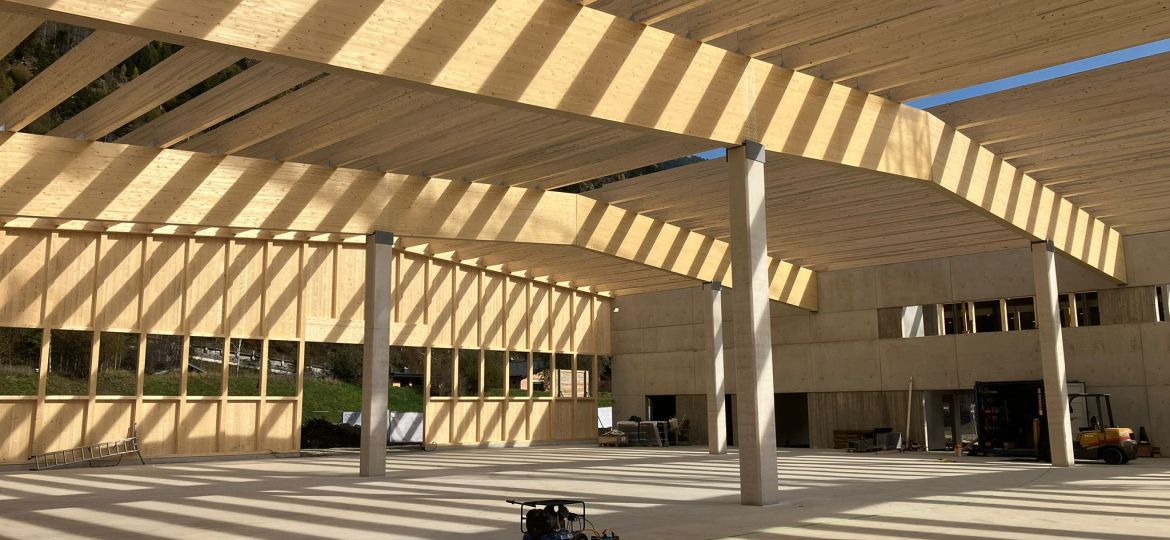 Das Arbeiten in einer Holzhalle ist anders. Es ist besser. Holzkonstruktionen übertragen weniger Schall als Stahlkonstruktionen. Holz dämmt besser, es riecht gut und schafft auch in großen Räumen ein gutes Raumklima.